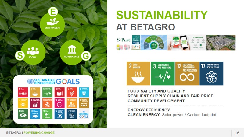 • Sustainability: การร่วมสร้างคุณค่ากับผู้มีส่วนได้ส่วนเสียในทุกภาคส่วน ด้วยการดำเนินธุรกิจตามหลักการ ESG ครอบคลุมด้านสิ่งแวดล้อม สังคม และบรรษัทภิบาล คู่ขนานกับการสนับสนุนเป้าหมายการพัฒนาที่ยั่งยืน (Sustainable Development Goals: SDGs) ของสหประชาชาติ โดยเฉพาะใน 4 เป้าหมายหลัก ซึ่งประกอบด้วย การขจัดความอดอยากและสร้างความมั่นคงทางอาหาร การส่งเสริมสุขภาพและความเป็นอยู่ที่ดีของทุกคน สนับสนุนความรับผิดชอบในการผลิตและการบริโภค และความร่วมมือเพื่อการพัฒนาที่ยั่งยืน ซึ่งสอดคล้องกับการดำเนินธุรกิจของบริษัทโดยตรง