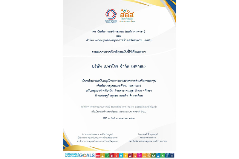 Bangkok – 22 May 2025 – Betagro Public Company Limited (BTG), a leading integrated food company in Thailand, was awarded a certificate of recognition for its contribution of over THB 5.6 million in wildfire protection equipment helps address the cause of PM2.5 air pollution across 10 community forests nationwide. Mr. Sontaya Jumjod, Vice President - Agro Production, and Mr. Thawat Matte, Division Manager-Community Relation, on behalf of Betagro, joined the “Certificate Presentation Ceremony for Supporting Community and Social Development under the BOI-CSR Initiative and Sustainability Expansion Dialogue” organized by the Community Organizations Development Institute (CODI) in collaboration with the Thai Health Promotion Foundation (ThaiHealth), and partners from government, private, and civil society sectors.