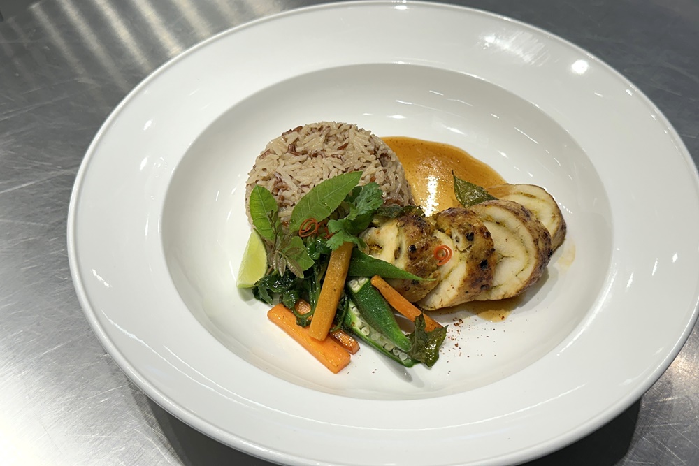 - Slice the chicken into pieces as desired. Arrange the dish and serve with stir-fried vegetables, Tamarind Sauce, and Bao Yod Muang Trang Rice (purple-tip rice) cooked with coffee beans from Chumphon.